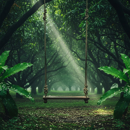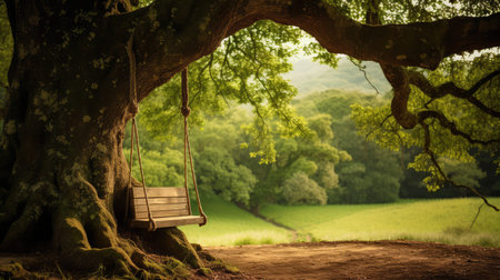 A charming garden scene featuring a handcrafted wooden swing suspended by hefty ropes beneath a lush, expansive canopy, surrounded by gentle sunlight, soothing green