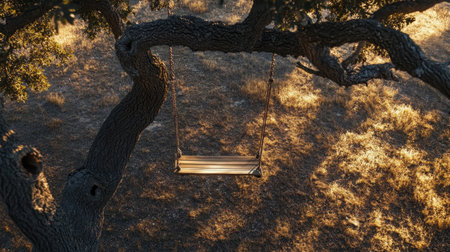 Cozy oak swing suspended from a sturdy branch, seen from above, capturing a moment of tranquility and simple outdoor joy.