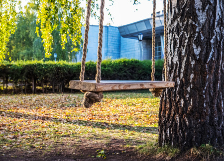 Children's swing fixed on the ropes against the backdrop of the setting sun day