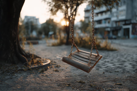 Empty swing swaying gently in a quiet children's playground during sunset in a city environment