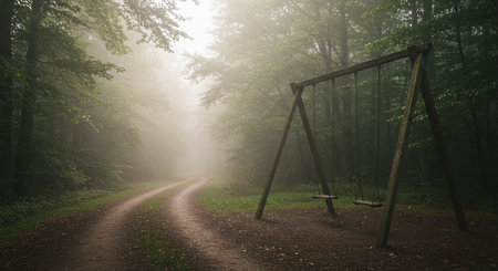 A serene and atmospheric scene featuring an empty swing hanging from a tree in a misty forest. The soft light filters through the trees, creating a tranquil mood.