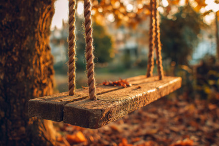 A tranquil scene of an empty wooden swing hanging amidst a forest bathed in the warm hues of autumn, with fallen leaves scattered on the ground.