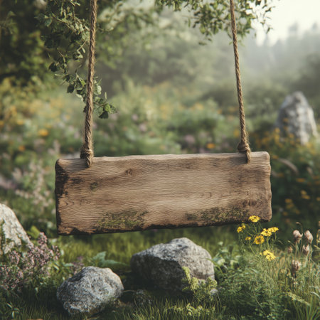 A rustic wooden swing suspended by sturdy ropes is located in a serene outdoor area. The swing invites relaxation and playfulness in nature.