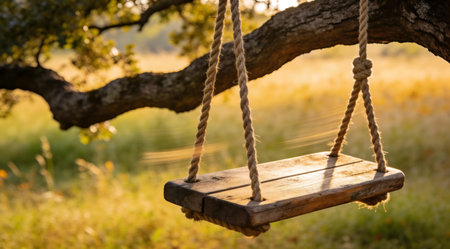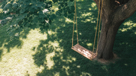 A serene wooden swing hangs gracefully from a sturdy tree. Sunlight dapples the grass below, creating a peaceful outdoor scene perfect for relaxation or play.
