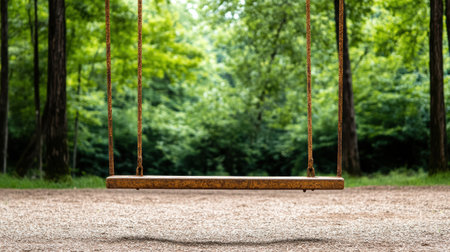 An empty wooden swing hangs silently in a softly lit green room, evoking a sense of quiet nostalgia and childhood memories. It waits patiently, a symbol of simple joys, solitude, and the peaceful passage of time.