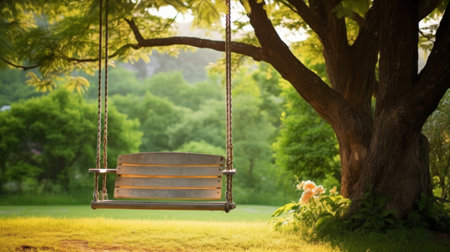 Tranquil wooden swing hanging in a lush garden oasis, providing a serene spot for morning relaxation