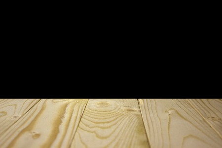 Empty wooden table backdrop on a black background.