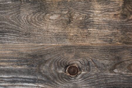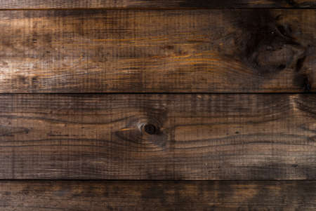 Vintage brown wood background texture with knots. Old painted wood wall. Brown abstract background. Vintage wooden dark horizontal boards. Yop view with copy space. Background for desk