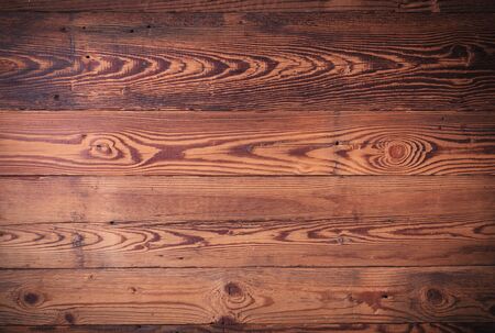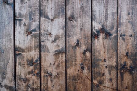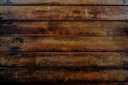Shabby wooden wall background. Obsolete carpentry boards, panel. Surface of wooden texture for design and decoration. Dark brown horizontal wood plank grunge texture. Natural backdrop. Copy space