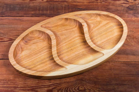 Empty oval compartmental dish with three departments of original design made with hardwood on the old rustic table