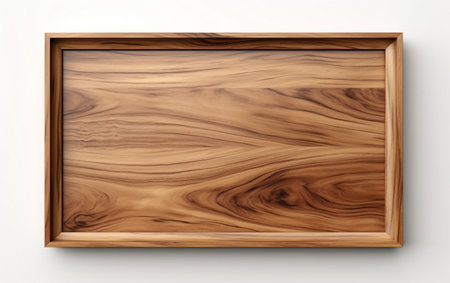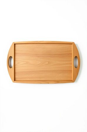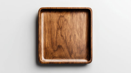 An overhead shot reveals a handcrafted wooden tray against a stark white backdrop. The tray showcases rich, warm tones, with visible wood grain and textures. The composition offers ample copy space, making it suitable for displaying food, objects, or as a design element for diverse commercial applications.