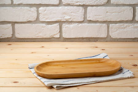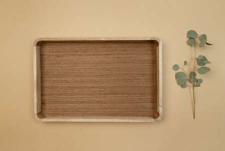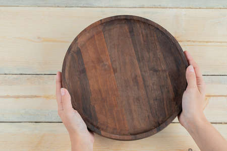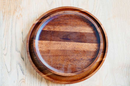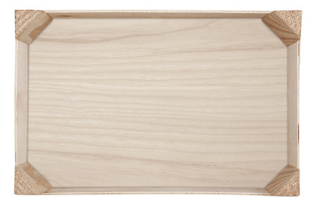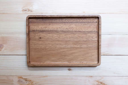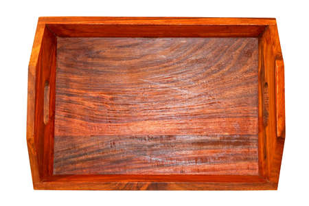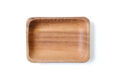 Top view of empty wooden tray isolated on background. Clean dish cut out.