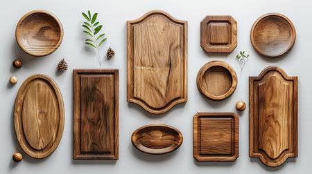 Set of wooden tray designs, in different shapes and sizes, isolated on a white background, in a flat lay arrangement. --ar 5:3 --v 6.1 Job ID: ef006243-23df-4b19-8f26-0330d08ab107