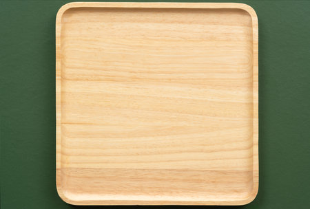 top view flat lay square natural wooden plate texture on dark green with copy space background.concept idea for organic food wallpaper,dessert backdrop.