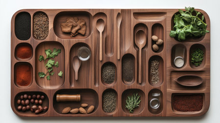 This wooden tray showcases a variety of spices, herbs, and cooking essentials, perfect for enhancing culinary creativity and organizing a vibrant kitchen space.