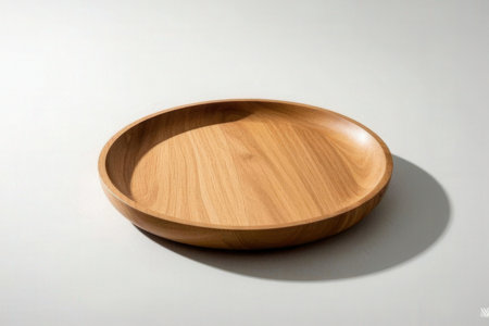 A rustic wooden plate displayed on a light background, perfect for culinary presentations. This piece showcases natural textures and warm aesthetics, ideal for any dining setting.