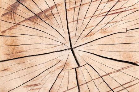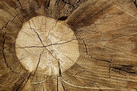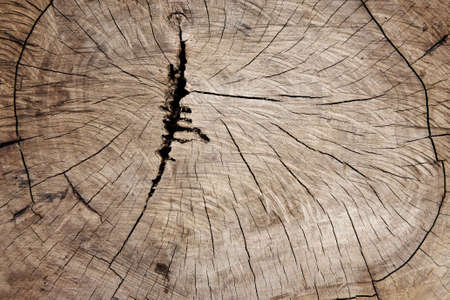 Tree trunk texture. Cross-cut of a tree trunk with cracks due to improper drying of the wood. Close-up of a log sawn across.