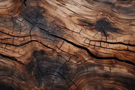 This image presents a detailed view of a tree stump, emphasizing its rugged texture and intricate growth rings. The warm brown tones and visible cracks suggest age and weathering. The composition highlights the organic form, suitable for various uses, including design and educational materials, demonstrating natural forms.