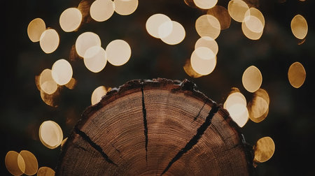 A captivating close-up of a tree stump featuring intricate textures, surrounded by a soft bokeh backdrop of glowing lights that evokes a serene atmosphere.