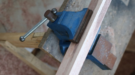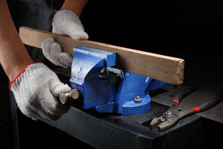 Closeup workers hands on a wooden plank locked in the iron vise