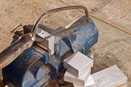 Sawing in a block of metal in a vice on a wooden workbench