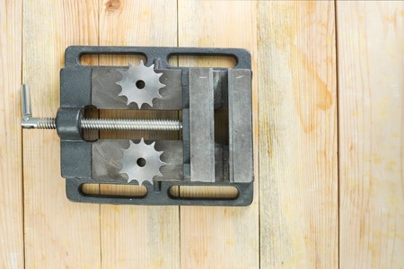 The vise to clamp on a wooden desktop environment tools.