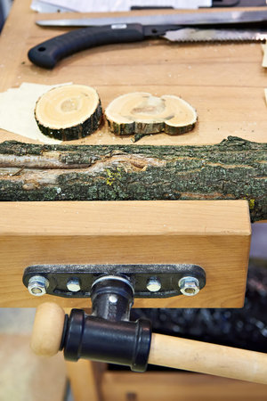 Mechanical working tool in a carpentry workshop. Manual production of wood and precious woods products