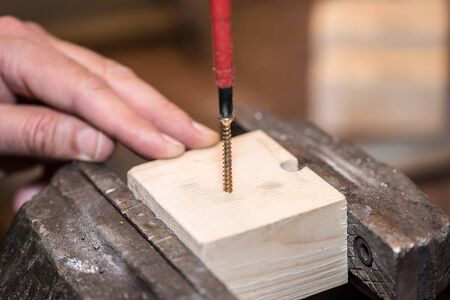 Worker is screwing a screw into wooden workpiece with the screwdriver