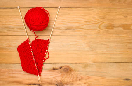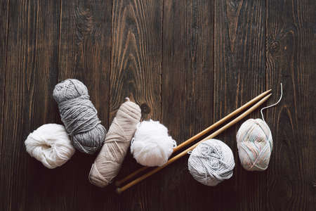 Yarn and needles for knitting, close up. Balls of thread and knitting needles on wooden background