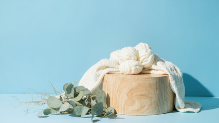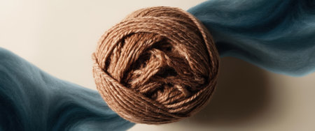 Brown yarn ball placed on blue merino wool top roving on beige background with copy space.