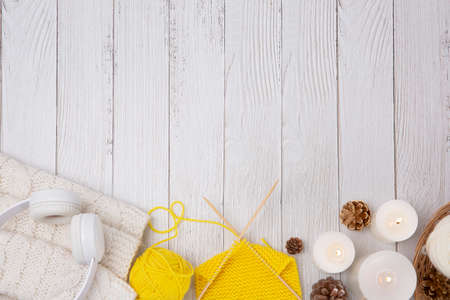 Earthy tones, warm colors yarn balls and knitting needles background. Cozy Crafts and Hobbies. Brown and yellow balls of yarn for hand knitting and wooden needles