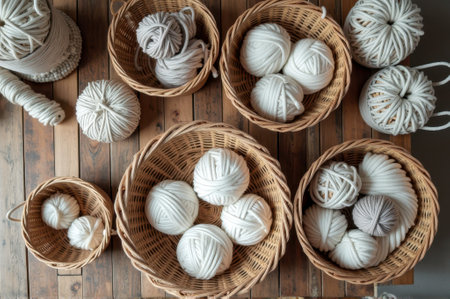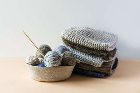 Balls of thread for knittingGray, brown and blue balls of knitting threads in a beige basket with bamboo knitting needles and a stack of knitted hats for winter and autumn, knitting hobby