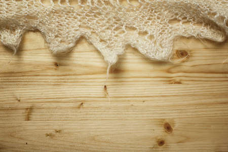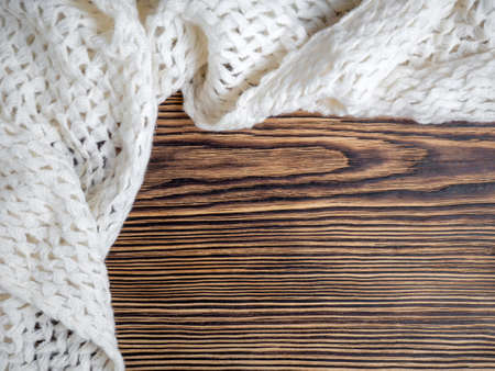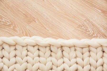 Knitted plaid of large knitting made of merino wool on wooden floor.