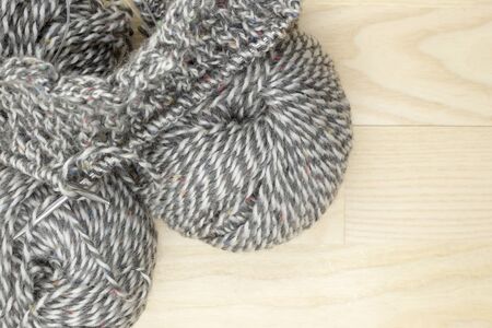 Balls of yarn and started knitting cloth on knitting needles. Melange grey wool yarn. Hobbies, needlework, handwork.