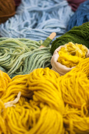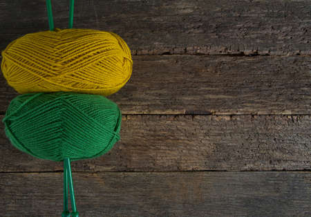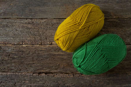 A skein of yellow yarn on a background, tied from yellow threads on wooden background of the mine space