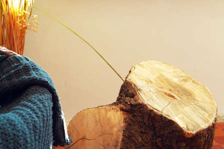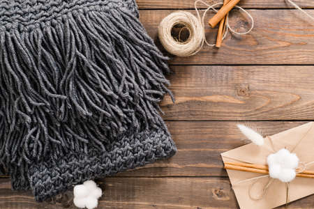 Cozy home desk, hygge, autumn fall concept. Women fashion scarf, craft paper envelope, cotton, cinnamon stick, rope on wooden background. Flat lat, top view, copy space.