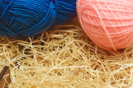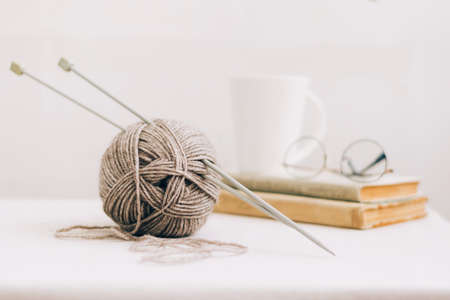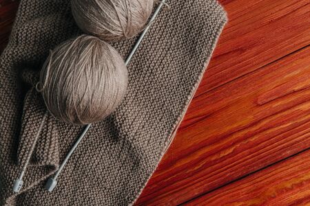 Balls of woolen yarn for knitting on the table. Warm clothes mad