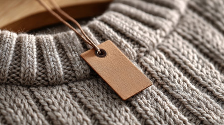 A wool sweater is displayed with a price tag attached to the neckline. The light shines softly on the fabric, showing the texture clearly. The setting is indoors.
