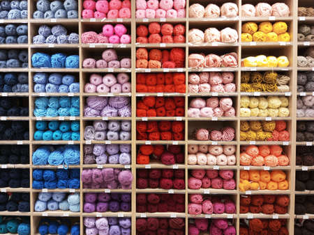 Shop shelf with monochrome yarn for knitting. Beige grey color for creativity, crocheting and needlework. Pastel yarn balls full frame vertical background
