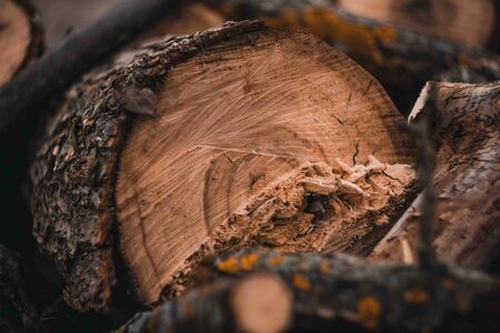 Pile of wood logs background. Round wooden texture. Freshly cut tree wooden logs for winter