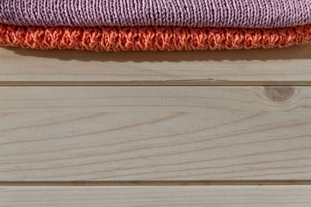 knitted folded clothes of purple and coral color on light wooden light background, copy space