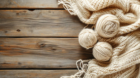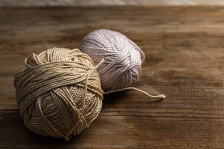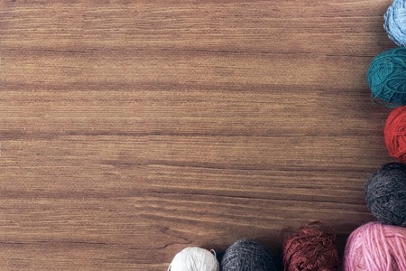 Balls of wool cotton silk yarn set on copy space wood background on left