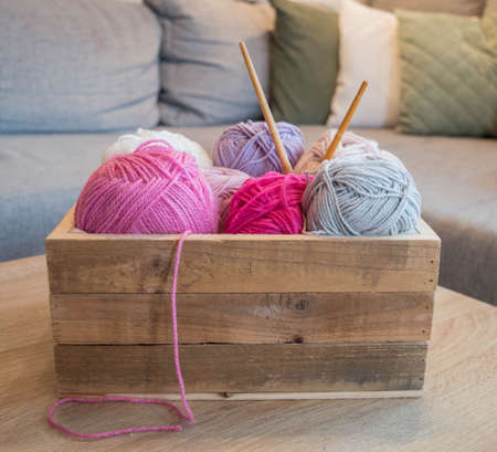 Colorful woolen balls in a wooden box with bamboo knitting needles handmade