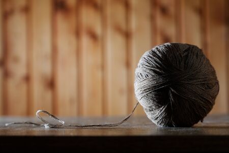Clew of gray homemade wool yarn with needle. Rustic wooden background