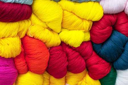 Balls of woolen yarn for knitting as a background. Selective focus.