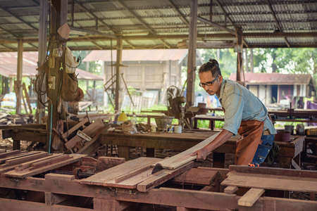 Carpenter working on wood craft at workshop to produce construction material or wooden furniture. The young Asian carpenter use professional tools for crafting. DIY maker and carpentry work concept.