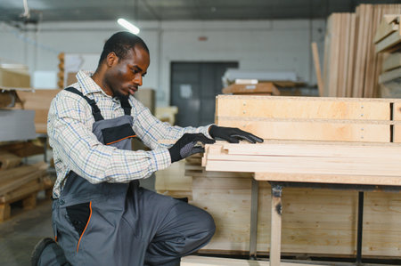 Carpenter checking wooden planks in a lumber warehouse, ensuring quality and precise measurements for woodworking projects