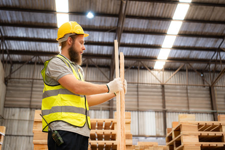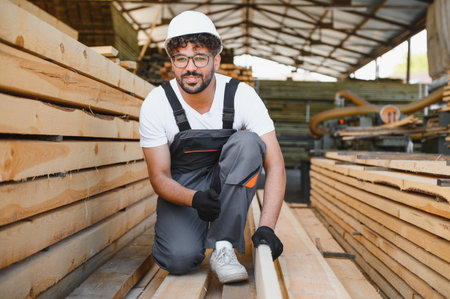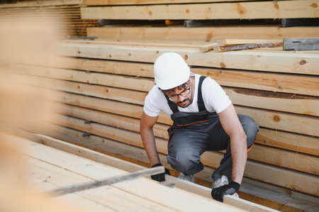 Young carpenter checking wood planks in a timber warehouse, wearing safety helmet and gloves, ensuring quality control in lumber production