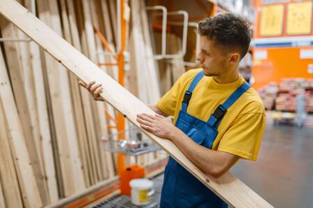 Constructor choosing wooden boards, hardware store