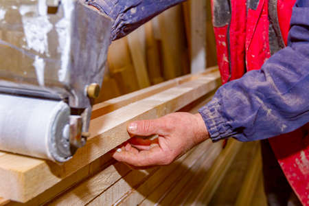 cropped view of carpenter with plank working on bench thickness tool in workshop